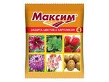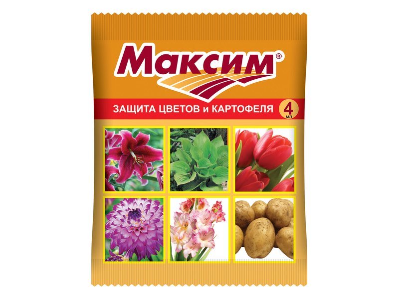 «Максим» — Препарат защитно-контактного действия для защиты от болезней луковичных (тюльпаны, гладиолусы, лилии и т.д.), георгинов, пионов, корней и корневищ других цветов, а также семенного картофеля. Создает защитный барьер на поверхности посадочного материала и в прикорневой зоне в почве. Эффективен против всех видов гнилей, плесеней, фузариоза, ризоктониоза, парши и других заболеваний. Защищает растения от болезней в течение всего периода роста и хранения.