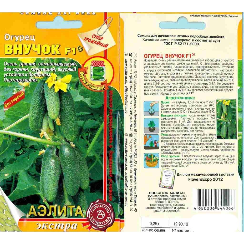 Очень ранний самоопыляемый партенокарпический гибрид для открытого грунта, пленочных и стеклянных теплиц. Отличительные свойства: увеличенный период плодоношения, высокая урожайность и товарность плодов. Устойчив к основным болезням огурца: вирусу огуречной мозаики, настоящей мучнистой росе, оливковой пятнистости, корневым гнилям, толерантен к ложной мучнистой росе. Растение среднеплетистое. Зеленцы корнишонного типа с маленькими семенными камерами, мелко-бугорчатые, с белым, плотным опушением, овально-цилиндрической формы, крепкие, хрустящие. Масса зеленца 63-76 г, длина 7,5-9,0 см, соотношение длины к диаметру 3,1:1. Отличается великолепными вкусовыми качествами в свежем виде, при консервировании и засолке. Горечи не содержит. Компания «АЭЛИТА» является эксклюзивным продавцом гибрида огурца «Внучок F1»® на рынке семян.