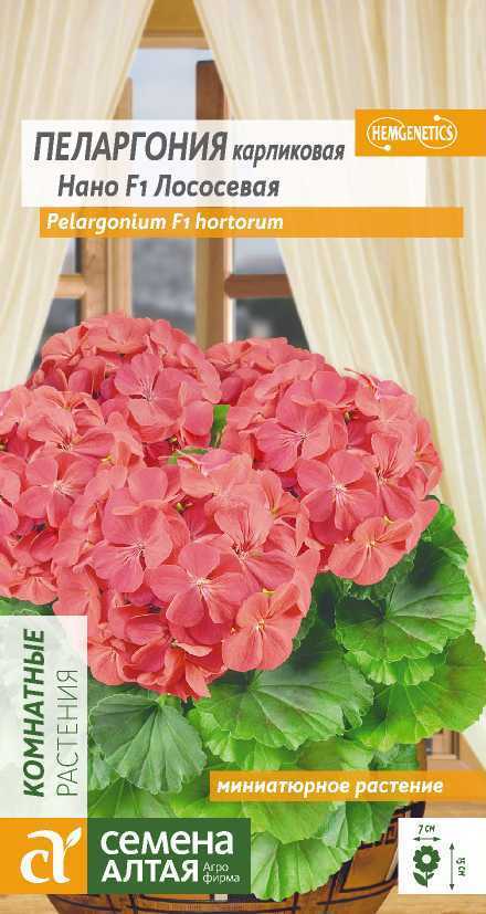 Уникальная карликовая пеларгония. Очаровательное низкорослое растение, в период цветения формирующее множество цветоносов, покрытых лососево-розовыми цветками, собранными в шаровидные соцветия диаметром до 7 см. Розетки листьев очень плотные, темно-зеленые. Растение не вытягивается, не требует применения регуляторов роста. Посадки образуют сплошной цветущий ковер. Широко используется в озеленении лоджий, веранд, балконов, для создания композиций в саду, а также в качестве почвопокровного растения. Уход за пеларгониями не требует значительных усилий. Рекомендуется выращивать в хорошо освещенных местах, избегая попадания прямых солнечных лучей. В теплое время года необходим обильный частый полив, в холодное – поливают умеренно. Подкармливают растения калийными удобрениями. Посев семян проводят с февраля по март. Всходы появляются через 2-3 недели после посева. При появлении 2-3 настоящих листьев растения пикируют. Для увеличения количества побегов и лучшего цветения побеги прищипывают в фазе 4-5 пар листьев.